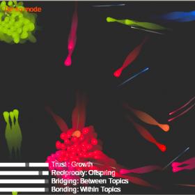 An experiment on minimal visualizations of human communities. These minimal creatures have offspring, fight and die depending on "social capital" data from a human community. We use semantic and graph analysis of twitter interactions to compute our data. You can try a static version here.